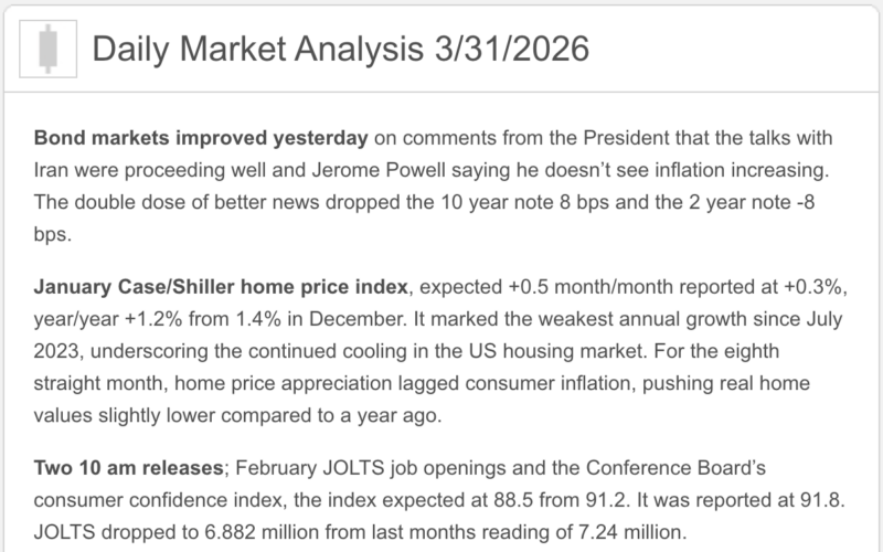 I am not sure the improvement will continue through the week, as we have a lot of economic data to come. Today’s Jobs Opening Report (JOLTS) was weak and about 5% below expectations. More people are looking for jobs than there are jobs available. That pendulum has swung.