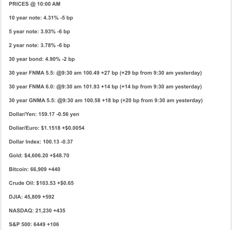 - The market setup this morning is friendly: 10Y down and MBS up.