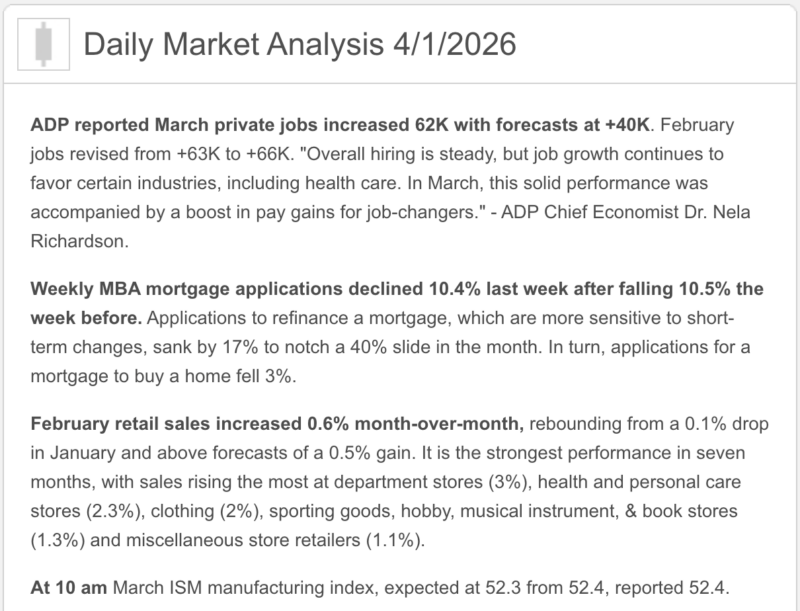This morning gave us two useful reads. First, ADP private payrolls rose 62,000 in March, better than the 40,000 expected, but still not exactly a chest-thumping labor print. Second, ISM manufacturing rose to 52.7, the highest since August 2022, which says manufacturing is still expanding.