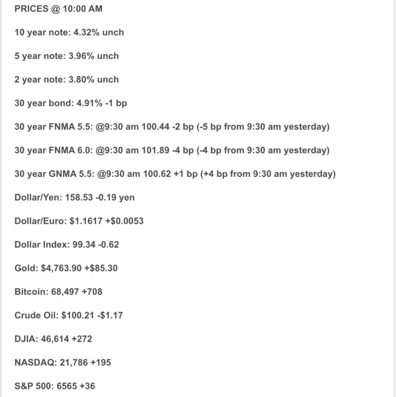 This morning, bonds are having a good day. Mortgage bonds and rates are outperforming Treasuries for the moment. I would look at today as an opportunity to lock. There will be a lot more volatility this week as the data mounts tomorrow and Friday.
