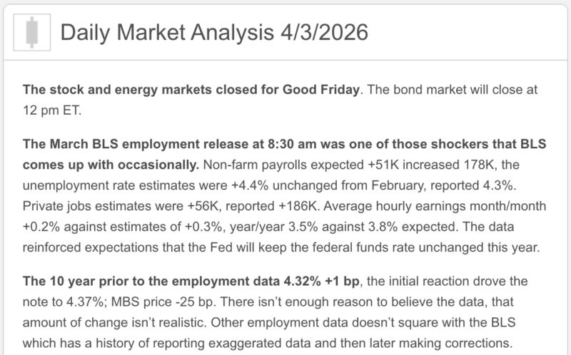 Although the initial reaction was bad, bonds quickly started to recover, which we have seen happen before as traders dig past the strong headline numbers to see that the labor market is not nearly as strong as the headlines would make it appear. Today will bring reduced trading volume, it’s Good Friday and the bond market closes at 2pm ET, and will be closed Sunday for Easter.