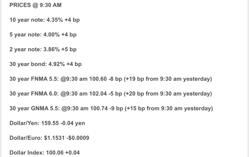 Rates are slightly better than this morning, despite the Jobs report showing 178,000 jobs created and unemployment falling to 4.3%. There are, of course, backward-looking revisions, but this report is not credible (why traders took it with a grain of salt for the most part). The decline in the unemployment rate came with an asterisk: The labor force shrank by nearly 400,000 people, meaning fewer people were counted as unemployed. The share of Americans working or looking for work slipped to 61.9%, its lowest level since the fall of 2021. That means the “real” unemployment would be higher.